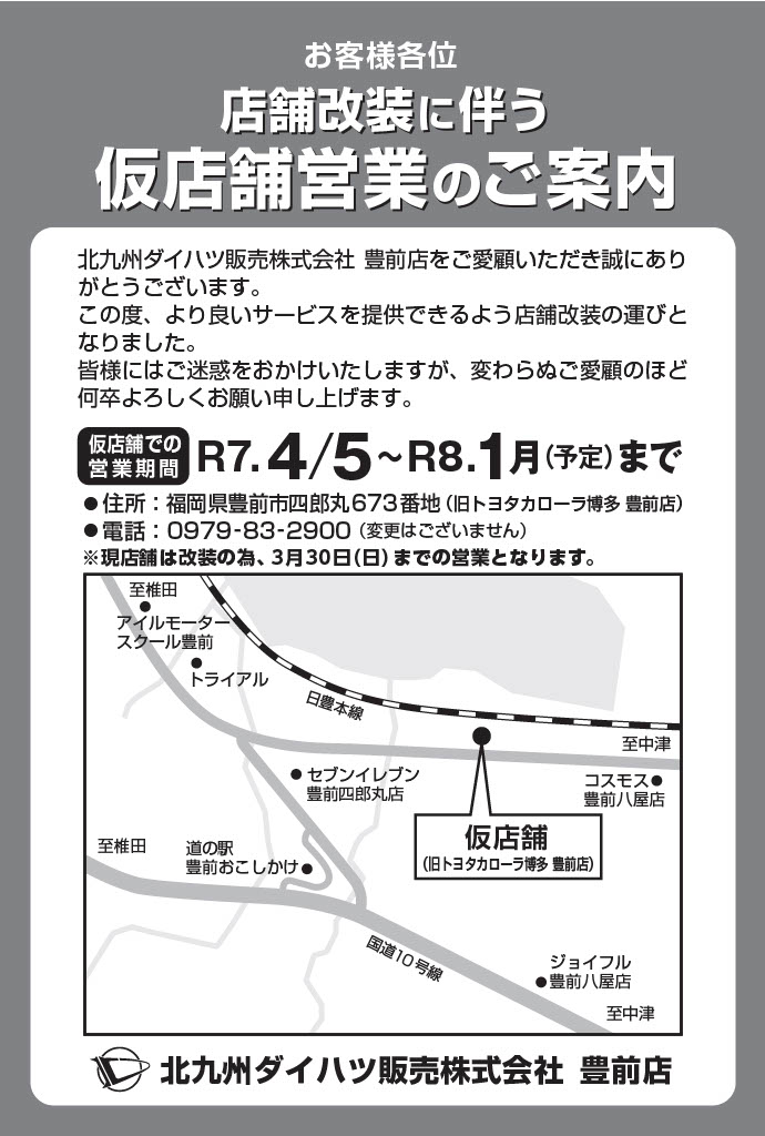 現店舗改装期間につきましては仮店舗での営業となりますので詳しくは下記をご確認お願いいたします。